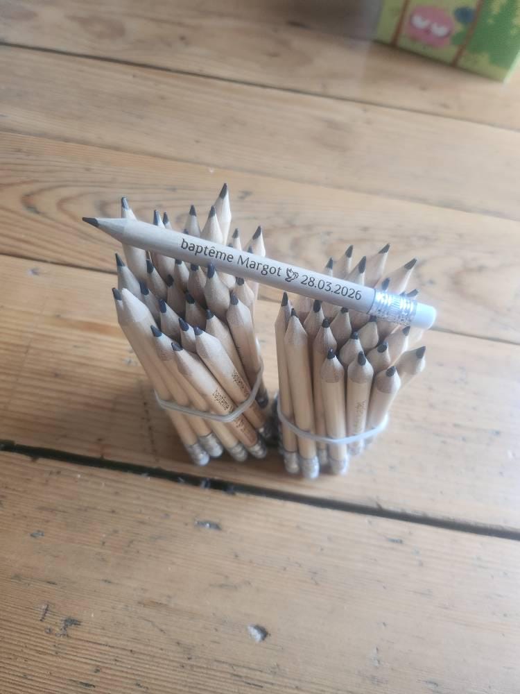 Mini baptism pencils are often decorated with religious symbols, such as crosses or doves, and can have the name and date of the baptism as a personalized touch. They can also come in a variety of designs to match the christening theme or the gift recipient's personal preferences.