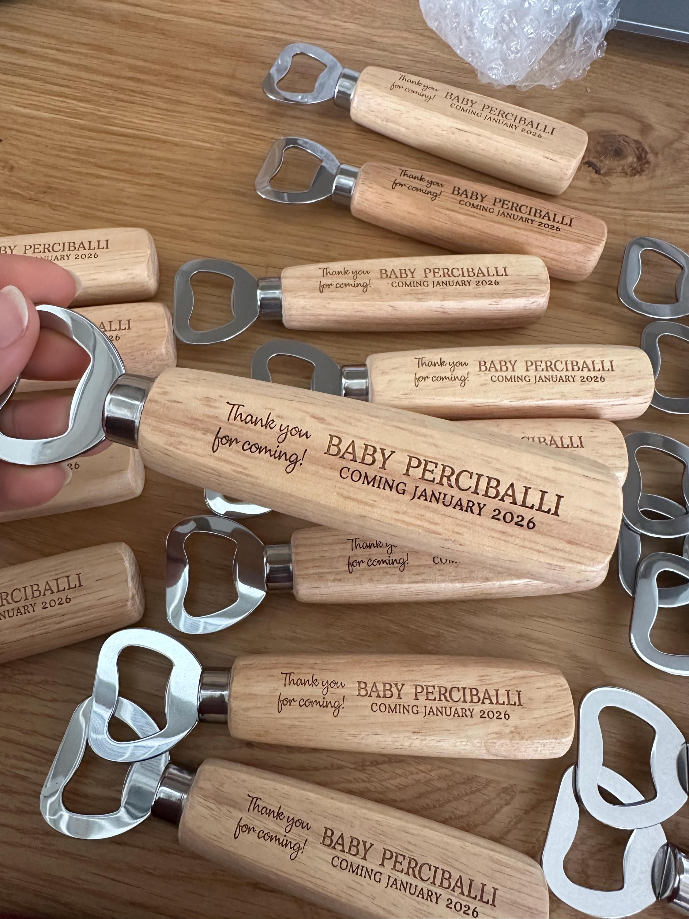 The bottle openers are made from natural wood and metal. They are engraved using a laser to ensure a perfect image that will not fade over time.